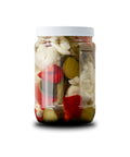Ingredients: Cauliflower, Carrots, Water, Vinegar, Salt, Sugar, Jalapeno Pepper, Cucumber, Sweet Pepper, Stringbeans, Garlic.